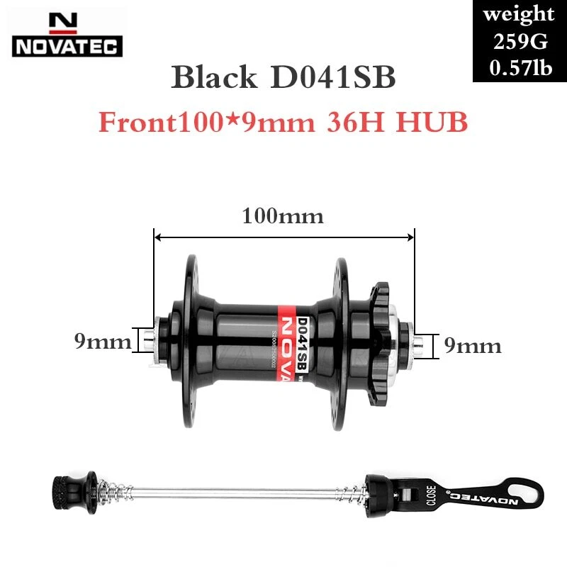 Hub front D041SB-B15 alloy, anodized black, 36H/14G, with Novatec HRWT 360 Degree logo, with ANO.BLK SIDE CAPS, without QR, 2xNBK bearings